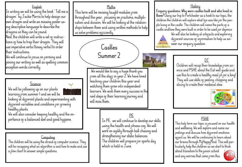 Our Topic this term is ‘Castles’. In this topic we look at all aspects of medieval life. We will be finding out what castles are, why they were built and learning to name the different parts of the castle. We will be thinking about the people who lived and worked in castles, from Kings and Queens to Knights to peasants! We will also discover more about the weaponry used in those times and how castles could be attacked and defended in a battle. We will be focusing on Portchester Castle in particular and learning about the location of it and how its uses have changed over the years.